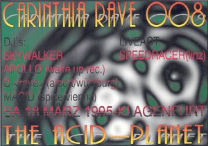 Carinthia Rave (the acid planet) / Trigon Tiefgarage A-Klagenfurt / Spring 1995 Line up: Macid, Speedracer, Apollo, Skywalker,D-rave